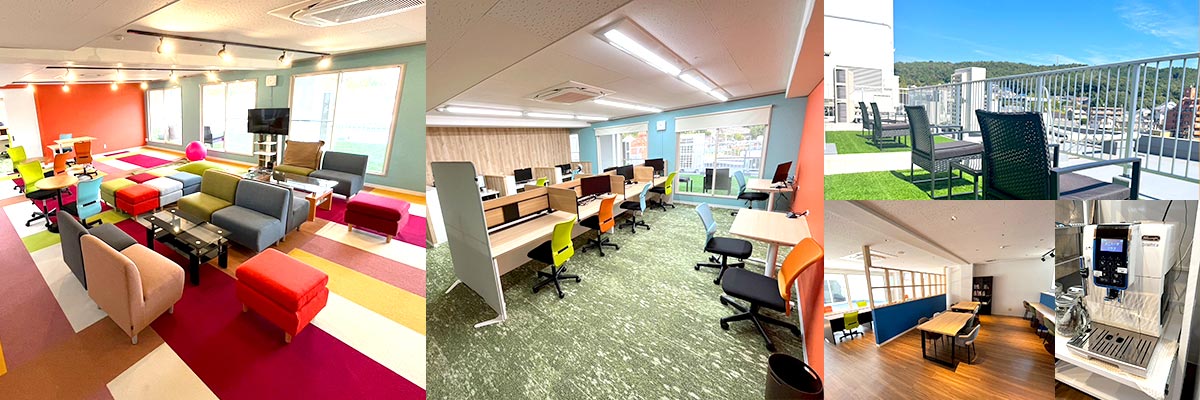 1人で集中して仕事や勉強ができる集中スペース、会話や交流ができるコミュニケーションスペースを分けています。 また食事をする飲食スペース、ZOOMミーティングなどを行うフォンブース、広いテラスがありますので目的や気分に合わせてご利用ください。